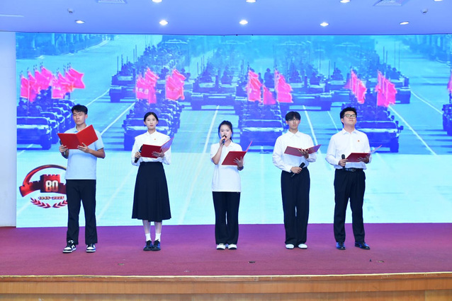 研究生代表李婷、徐雨桐、张婉琪朗诵了诗歌《青春献给新时代》,表达了将个人理想融入国家发展的青春誓言。校教师朗诵团随后演绎了《不朽的抗战》和《祖国颂36365情》两首诗歌,朗诵者声情并茂,抒发了对祖国的热爱与对母校的深情,帮助青少年树立坚定的理想信念。