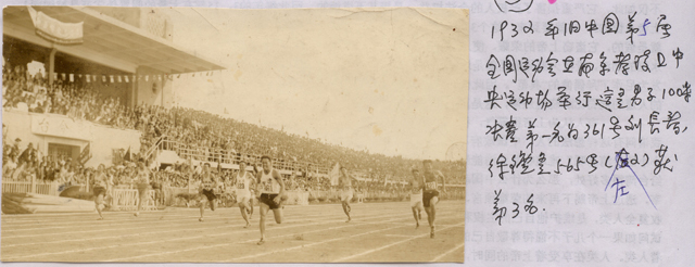 1933年中华民国第五届全运会100米比赛,中国奥运第一人刘长春(361号)在中央体育场比赛,