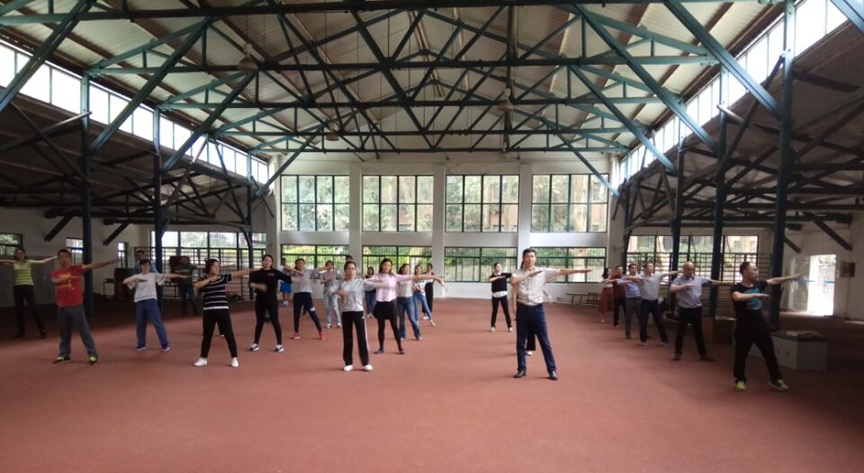 为丰富教职工文体生活,营造团结奋进、欢乐喜庆的校园文化氛围,以积极向上的精神风貌迎接党的十九大胜利召开,根据校工会组织开展广播操展演的要求,10月10日中午12点30,体育系工会组织全系老师在田武馆学习第九套广播体操。