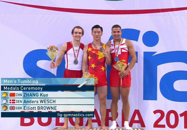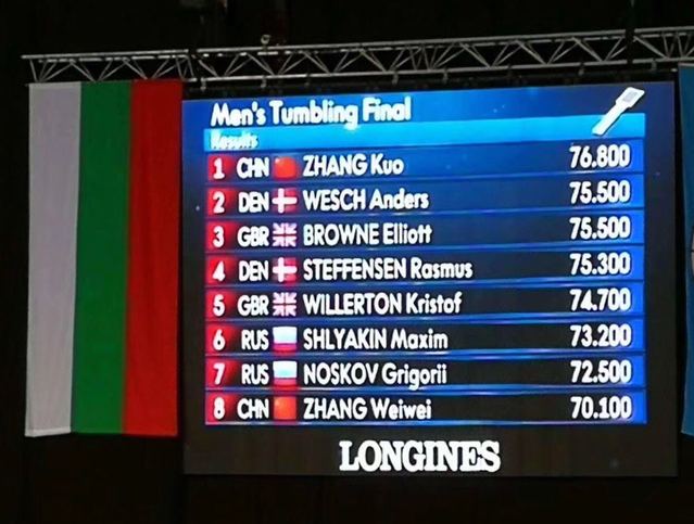 北京时间11月12日22点,在保加利亚索菲亚举行的第32届世界蹦床锦标赛上,36365蹦床队运动员张阔不畏强手,敢打敢拼,出色地完成了两套动作,以76.80分的成绩夺得金牌,丹麦和英国选手分获二三名。在11日的男子团体决赛上,张阔与队友合作,摘得银牌。张阔成为36365第99位世界冠军,也是江苏蹦床队第3位世界冠军,第2位男子单跳世界冠军。