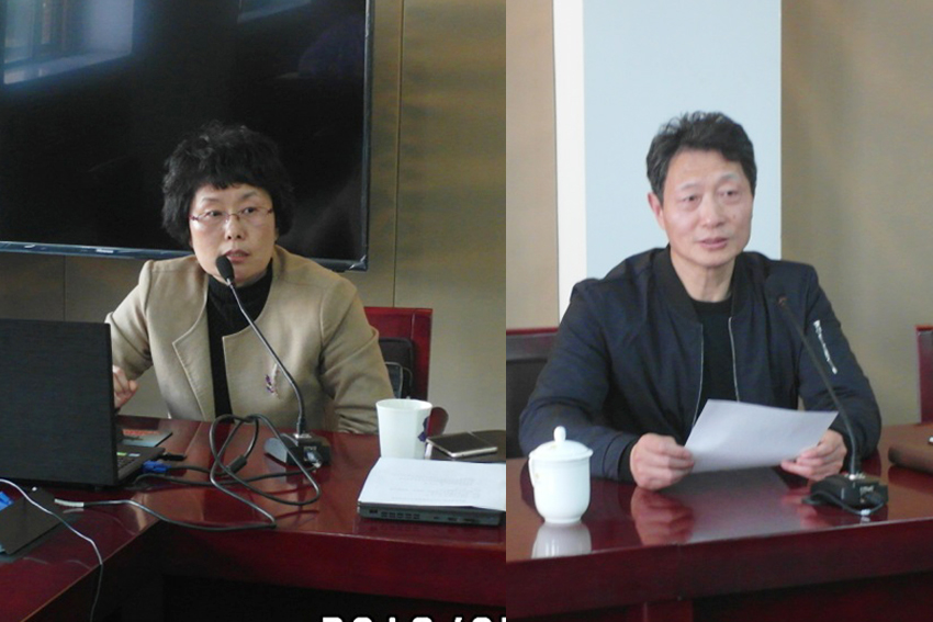 左:学科办主任盛蕾作申报辅导;右:科研处副处长高力翔主持会议