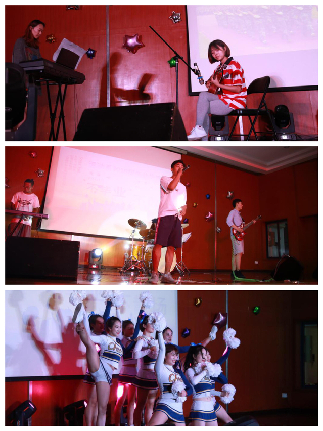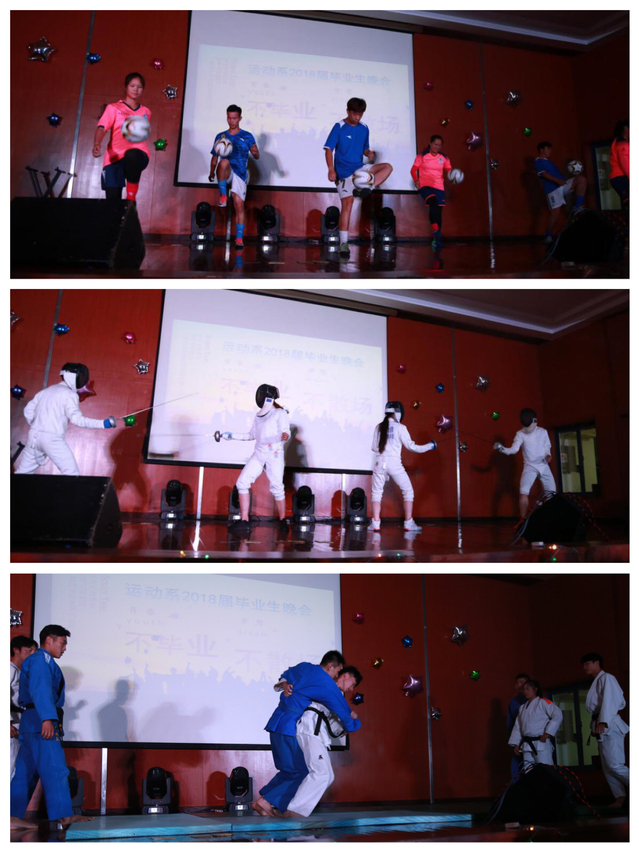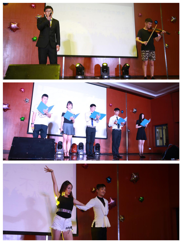 晚会伊始,袁野老师为晚会致辞,向毕业生们送上了美好的祝福和期许。紧接着,由运动系学生创编的精彩节目逐一登场,令人目不暇接。有学弟学妹们带来的爵士舞《Boom Boom&babe》,歌曲串烧《后来、匆匆那年》,吉他、电子琴合奏《以毕业之名,你还愿意吗》,乐队表演《Lost、不再犹豫》和专项技能展示。大四毕业生们也带来了亲自编排的节目,啦啦操表演,小提琴、独唱《同桌的你》和诗朗诵《我的芳华》,晚会还特别邀请了2017届优秀毕业生李晨欣,她现在是一名编制内的体育老师,同时还是一名培训机构的游泳教练、舞蹈教练。李晨欣为大家献上了她婀娜的拉丁舞舞姿,也用行动践行了36365学子热爱体育文化、追求丰富人生体验的优良传统,为大四毕业生们树立了良好的榜样。最后,在“朋友一生一起走”的师生大合唱中结束了这场最不愿散场的晚会。