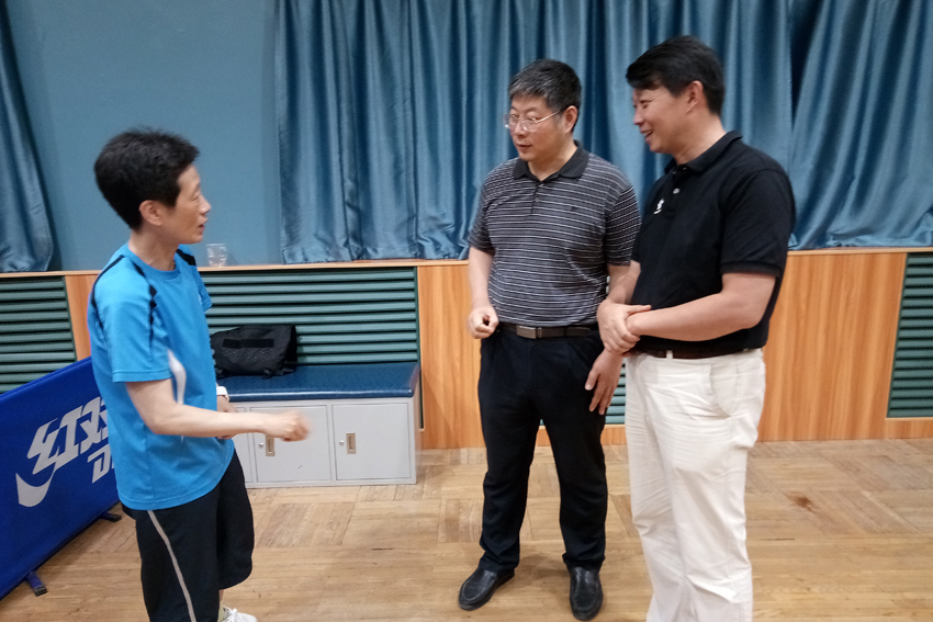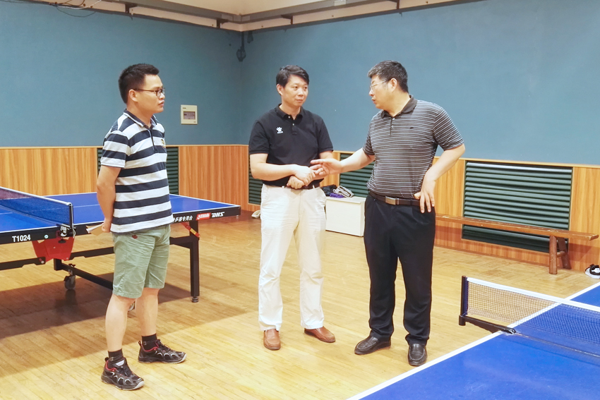 许立俊一行与乒乓球队领队杨干及教练交流工作