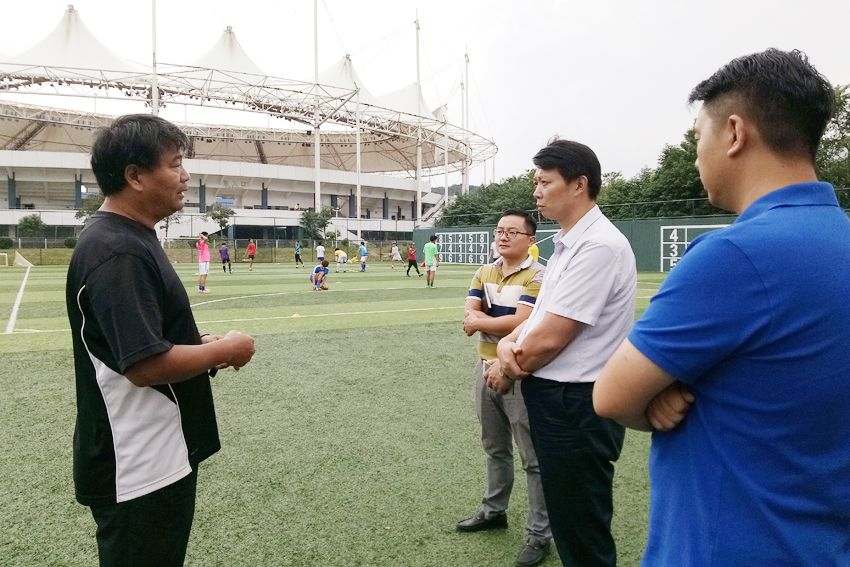 运动系大球教研室主任孟宁向许立俊一行介绍相关情况