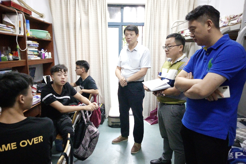 在仙林校区,许立俊一行首先来到运动系C117寝室,与该寝室网球专项的四位同学进行了交流,详细了解了他们的学习生活情况,认真记录了他们提出的奖学金发放、网球赛事参赛及寝室设施维修等问题,并建立了微信交流群。随后,许立俊一行来到仙林校区足球场,认真观摩了足球专项21747班的足球课。上课教师运动系大球教研室主任孟宁向许立俊一行介绍了相关情况,提出了足球教学场地不足等问题。许立俊一行还与运动系党总支副书记、副主任杨晖就“六联系”相关工作进行了交流。
