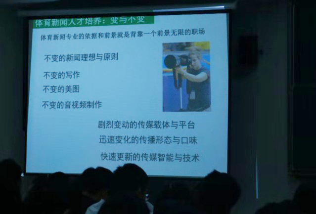 最后,郝勤教授对体育新闻专业人才培养的“变”与“不变”进行了分析,并向在坐的同学们提出了几点忠告,作为未来的体育记者,不仅应该了解和熟悉体育运动的相关知识,更要拥有一流的外语和强健的体魄。郝勤教授对体育记者现状以及未来发展方向的细致分析让同学们对此有了更加全面和直观的了解。讲座最后,李金宝教授再次感谢了郝教授的分享和带给同学们的启发。