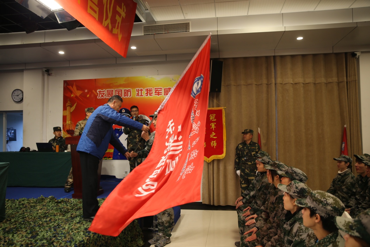 最后,开营仪式进行了庄严的授旗与宣誓环节。在雷鸣的掌声中,校保卫处处长、保卫部部长王竹林向军训训练营进行了授旗,参训学员向营旗郑重宣誓并签订军令状。