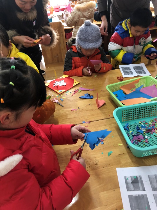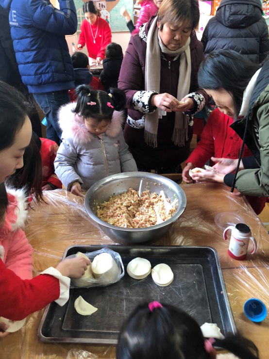 12月29日上午,孩子、家长、教师齐聚张灯结彩,年味浓郁的幼儿园。活动在雄壮的国歌声中以升旗仪式开始。紧接着是民表系为家长和幼儿园表演的舞狮子、设艺。接下来是全园的分散在各班的民俗游园活动。活动有:传统美食制作、传统游戏、传统艺术风等版块。传统美食制作体验活动中,老师和家长志愿者一起为孩子们提供了包饺子、搓元宵、蒸面糕等中华传统美食体验项目。孩子们在做一做、尝一尝中感受到中国舌尖上的文化;传统游戏贴鼻子让孩子们在欢笑中感受中国“玩”的文化;传统艺术风体验活动中更是展现了中华民族的文化艺术瑰宝,不但有青花瓷、写福字、捏面人儿、剪纸等众多体验活动,幼儿园还在小剧场里播放反映改革开放四十年来我们生活变化的纪录片。