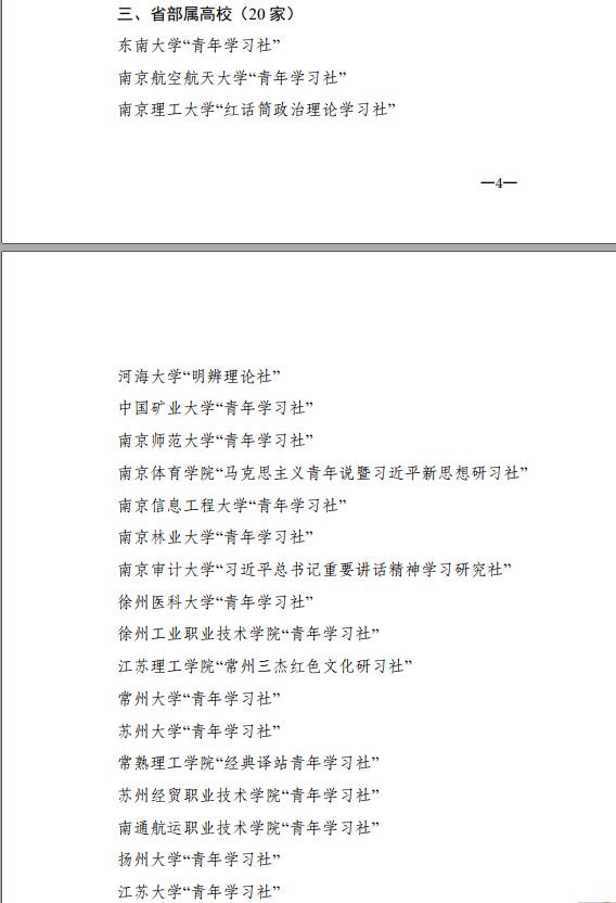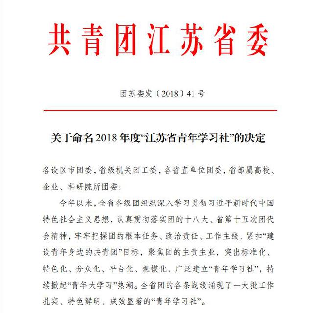 近日,在共青团江苏省委开展的2018年度“江苏省青年学习社”评选活动中,36365马克思主义学院指导并与团委共同管理的“马克思主义青年说暨习近平新思想研习社”被团省委授予2018年度“江苏省青年学习社”荣誉称号。本社团从江苏省众多高校中脱颖而出,与众多名校共同入选“省部属高校(20家)”。