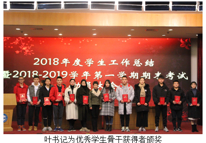 会上,叶瑛从学生党团建设工作、评奖评优工作、第二课堂活动开展、学生创新创业指导以及及技能竞赛参与等几个方面对2018年的学生工作进行了详细而全面地总结汇报,并向与会师生分享了下一年度的学生工作思路。随后,叶书记宣读了学生违纪处理决定,严厉批评违反校纪校规的同学,希望这些同学端正态度,改过自新。