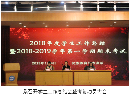 1月4日中午,民族体育与表演系在图书馆报告厅召开2018年度学生工作总结暨2018-2019学年第一学期期末考试动员大会。民族体育与表演系党总支书记、系主任吴晓红,民族体育与表演系党总支副书记、系副主任叶瑛,各年级辅导员,各班班主任及全系同学参加会议。会议由辅导员王一迪主持。