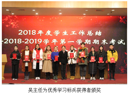 吴晓红宣读了我系2018年度“优秀班集体”、优秀学生骨干和“优秀学习标兵”的表彰决定,81641班、81541班、81642班和181641班四个班级获得“优秀班集体”荣誉称号;梁育榜、王翔宇等23名同学获得“优秀学生骨干”荣誉称号;周权、陈迎香等20名同学获得“优秀学习标兵”荣誉称号。吴晓红表示,希望受表彰的集体和个人珍惜荣誉,在今后的学习、工作中发挥先锋模范作用,再接再厉,再创佳绩,为我系建设良好的学风、良好的班风贡献出自己的力量。她希望同学们严于律己,求真务实,善于总结,积极备考,合理安排复习时间,努力获得好成绩。