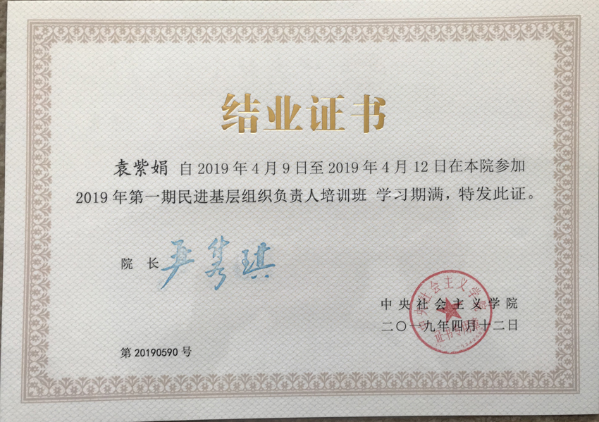 4月9号至12日,民进中央2019年第一期基层组织负责人培训班在中央社会主义学院举行。民进36365支部主委、36365体操队教练袁紫娟参加了培训。
