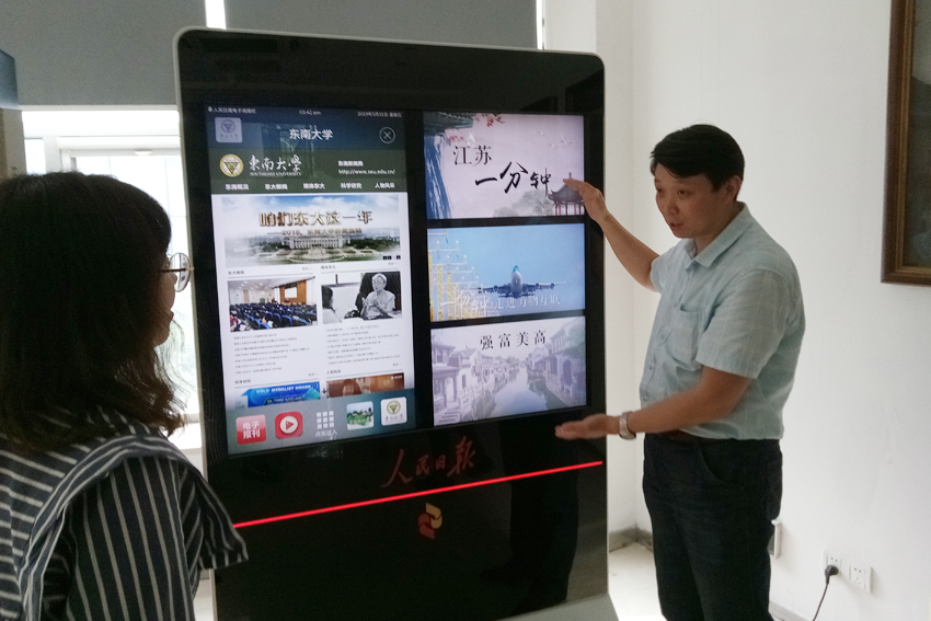 在人民日报江苏分社,人民日报数字传播(江苏)有限公司总经理鲍晓波向与会人员介绍了人民日报数字传播的最新发展情况和近期工作安排。相关工作人员介绍了人民日报电子阅报栏和打印机等产品,演示了产品的使用方法。