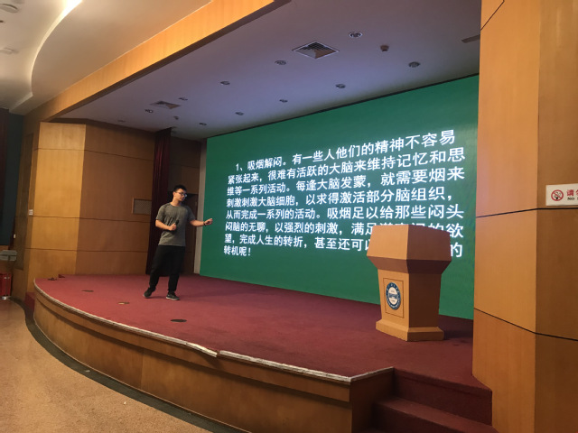 活动开始,通过反面实例介绍吸烟的七大“好处”。播放了香烟如何侵蚀人体的动画和戒烟后身体如何受益地动画短片,让同学们更加深刻地认识到吸烟的危害和戒烟的好处。随后,根据世界卫生组织划分的戒烟的十二个过程以及中国临床戒烟指南等内容,向大家介绍了如何科学正确地戒烟,避免进入戒烟的误区,以免香烟屡戒不断。