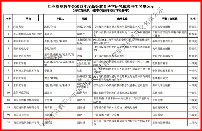近日,江苏省高等教育学会公示了2018年度江苏省高等教育科学研究优秀成果奖评选结果,36365张道鑫老师申报的《中国武术“道”之诠释》一文荣获二等奖。