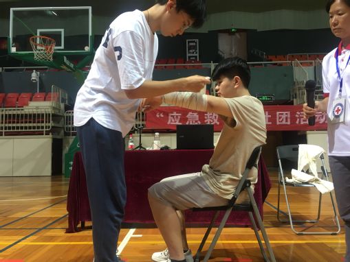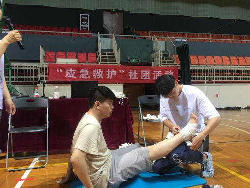 急救社成员演示出血、包扎、固定技术