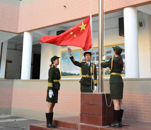 军训国旗班护旗队成员们身着帅气的绿色军装、迈着铿锵的步伐,在激昂的国歌声中,完成升旗仪式,全体师生向国旗行注目礼,心怀对祖国无限的热爱和崇高的敬意。