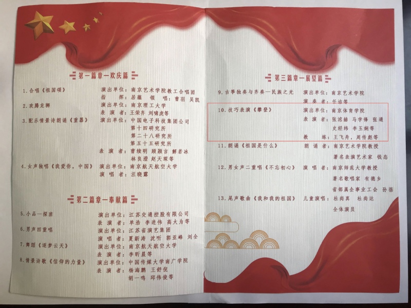 为做好此次文艺展演,展现36365风采,学校党委、行政高度重视,体操学院组织落实,技巧队在完成日常训练任务的情况下,积极配合,认真参加节目合成、彩排及演出,出色地完成了文艺展演。
