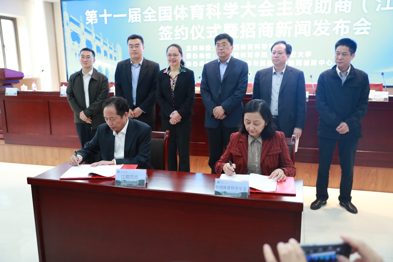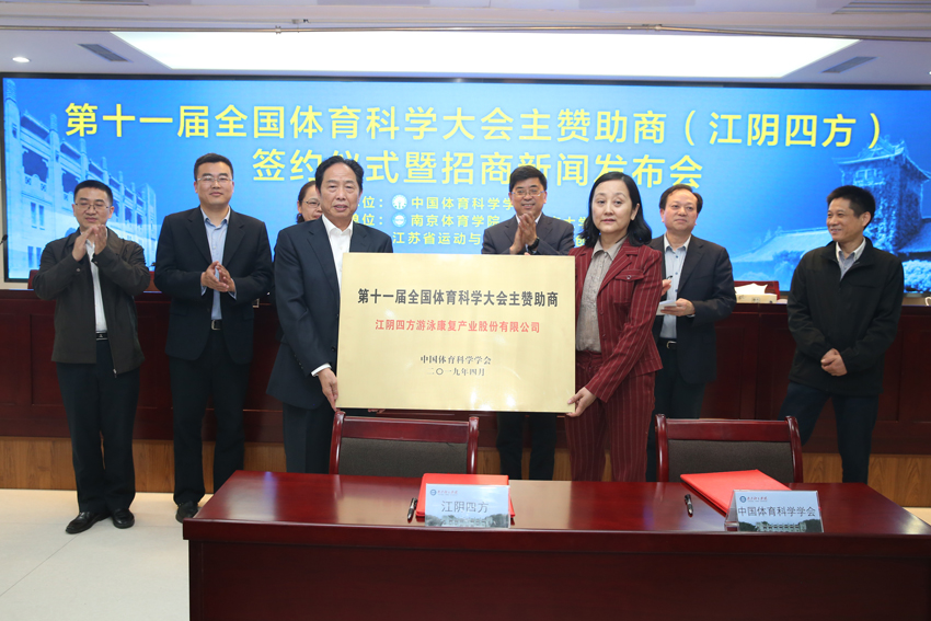 发布会上,中国体育科学学会副理事长祝莉代表中国体育科学学会与江阴四方游泳康复产业股份有限公司董事长史方度签约,并向江阴四方游泳康复产业股份有限公司授牌,此举标志着江阴四方游泳康复产业股份有限公司成为本届大会主赞助商。