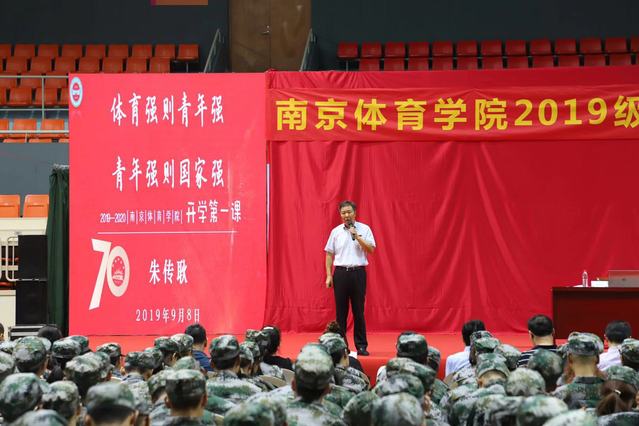 9月8日上午9时,校党委书记朱传耿在灵谷寺校区体育馆为2019级1116名本科生和研究生新生讲授了题为”体育强则青年强 青年强则国家强”的开学第一课。校党委副书记兰亚明主持讲座,机关相关职能部门负责人、各高等教育二级学院党总支副书记、学工办主任、大学生辅导员、2019级新生班主任和全体新生一起到会聆听。课程通过青春36365直播平台和奥林匹克学院分会场同步进行。