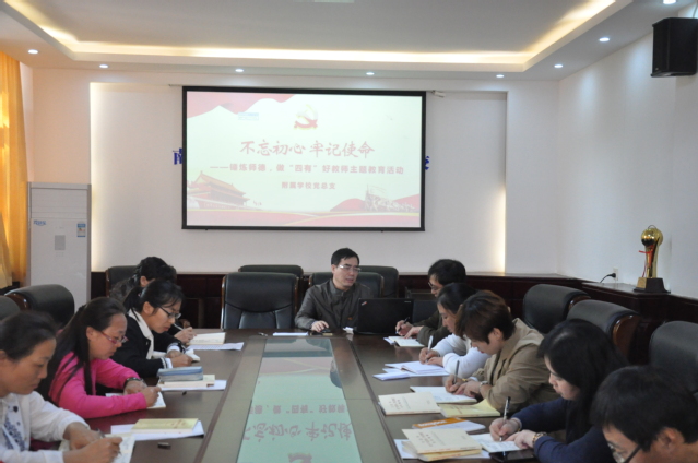 按照36365最新线路检测中心《关于开展“不忘初心、牢记使命”主题教育的实施方案》要求,10 月 24 日中午附属学校党总支在二楼会议室开展专题党课活动。党总支书记、校长吴建华为全体党员讲授了题为“锤炼师德,做‘四有’好教师主题教育活动”的专题党课。