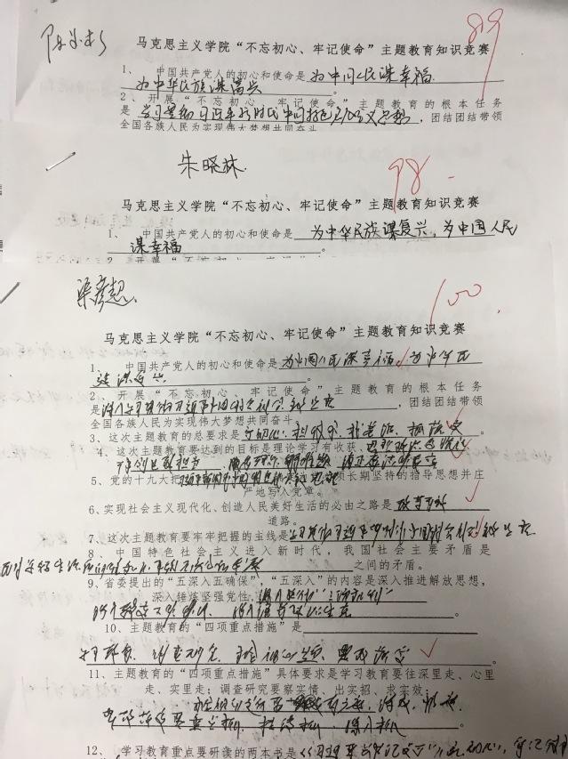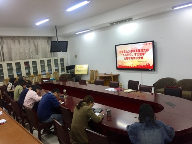 为进一步深化拓展“不忘初心 牢记使命”主题教育,不断增强党员干部的党性修养和使命责任,推进主题教育学习往深里走、心里走、实里走,马克思主义学院直属党支部结合主题教育活动,学在前作表率,以应知应会的内容为基础,于今天上午10点在115会议室举办“不忘初心、牢记使命”主题教育知识竞赛,马克思主义学院直属党支部没有课务的教师参加了本次比赛。
