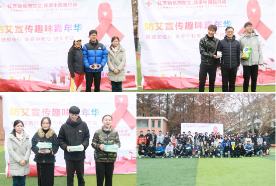 12月1日下午,校红十字会举办了防艾宣传趣味嘉年华,前期进行了精心的策划,吸引了不少同学报名参加。现场准备了狂舞飞绳、灵魂羁绊、踩爆气球、河流之王、马戏团长、抱团取暖等趣味游戏,中间穿插了艾滋病知识的宣传和竞答。通过宣传、游戏和竞答,大家了解了艾滋病的相关知识,特别是艾滋病的三个主要传播途径、有效的预防措施及国家对艾滋病人四免一关怀的政策,呼吁大家消除对艾滋病人的歧视,关心关爱他们,同时要洁身自好、远离毒品,作为当代青年人更要有所担当,主动加入到宣传防治艾滋病的队伍中来。活动请到了运动康复医院副院长刘桂彩、体育教育与人文学院副书记卢奎给获奖同学颁奖。最后,无人机的空降把活动推向高潮,大家摆出一个巨大的象征关爱艾滋病人的标志——红丝带。天气虽然阴冷,但是大家参加活动的热情很高,增长了知识、增进了友谊!