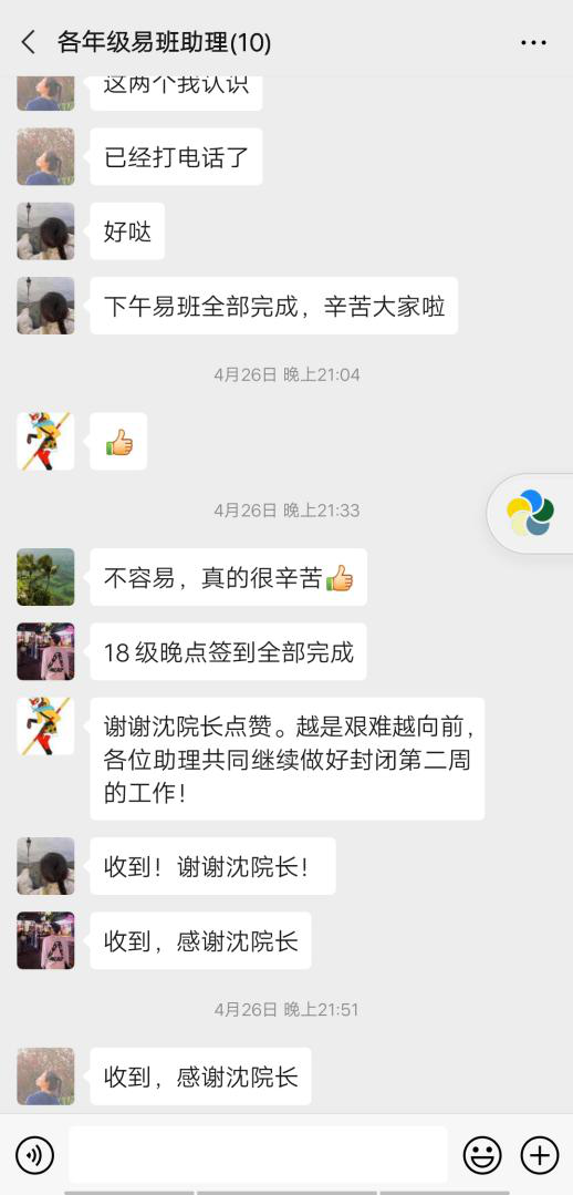选聘年级助理协助年级辅导员做好防控期间常规事务,一定程度上缓解了我院辅导员人手紧缺的压力。