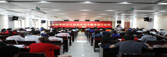 5月4日下午,击剑学院举行反兴奋剂承诺书集体签订仪式。学院全体管理干部、教练员、运动员以及体校运动员参加了会议,会议由击剑学院直属党支部副书记徐炳生主持。