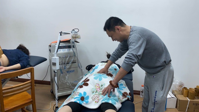 每天训练结束后,队医在运动队理疗室给队员做按摩放松治疗