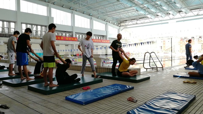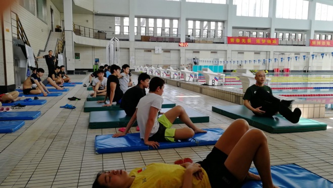 3月14日上午,竞技体育研究院副院长秦学林给游泳队运动员上大强度训练课后的牵拉放松示范课