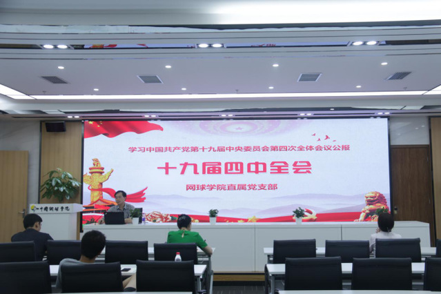 传达学习会议结束后,网球学院直属党支部召开了专题组织生活会,直属党支部书记丁习明带领党员同志和入党积极分子,集中学习了中国共产党第十九届中央委员会第四次全体会议精神和习近平总书记重要讲话精神。
