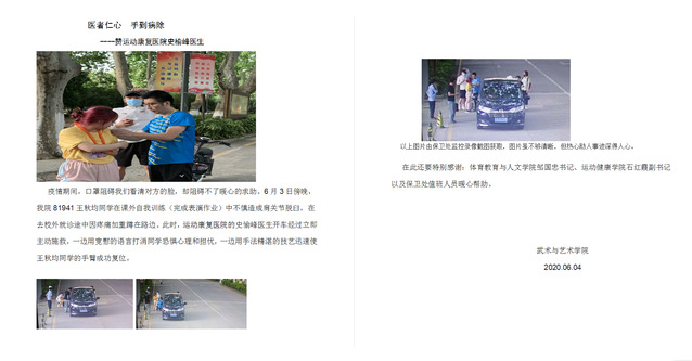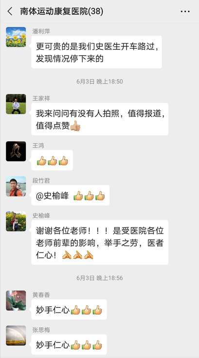 2020年6月3日傍晚,校武术与艺术学院学生王秋均,由于训练不慎造成肩关节脱臼,在外出就诊途中疼痛难忍,蹲坐在校西大门路边。此时,我运动康复医院史榆峰医生正巧下班开车路过,随即主动下车询问,一边宽慰同学,一边细心检查,果断选择脚蹬复位法,为王秋均同学进行了紧急的救治,手法精湛,即刻解决了王秋均同学的病痛。第二天,武术与艺术学院专程写来了感谢信,赞扬史医生“医者仁心手到病除”的爱心救助行为。史医生的事迹也在医院内部引起强烈反响,大家纷纷为他点赞!而他却十分低调谦虚。