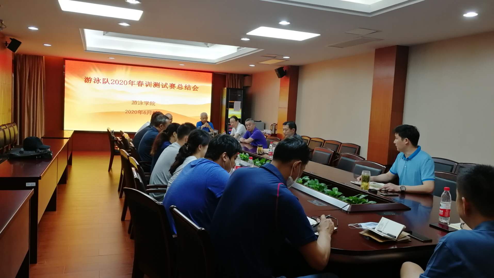为进一步总结经验、查找问题,做好下一阶段训练比赛工作,6月5日上午,游泳队在行政办公楼301会议室召开2020年春训测试赛总结会。校党委常委、副校长金松,训练处处长刘健,竞技体育研究院副院长秦学林,校训练督查组专家任大新、李辉,游泳学院相关管理干部和游泳队全体教练员参加了会议。会议由游泳学院党总支书记、院长王伟新主持。