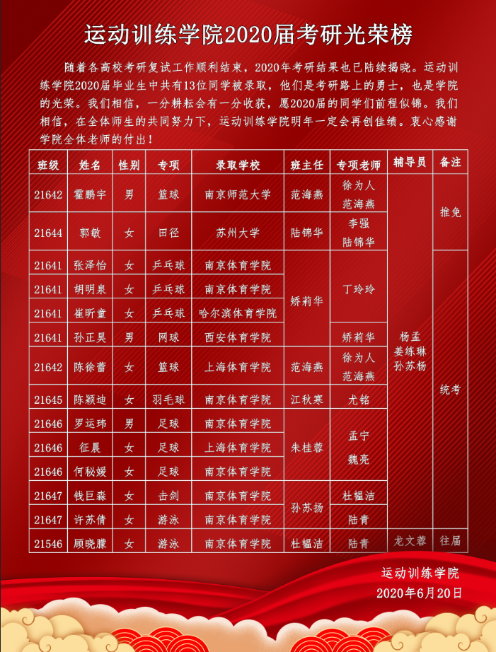 运动训练学院2020届毕业生在考研大军的队伍中,共有13位同学被录取,愿2020届同学们前程似锦。