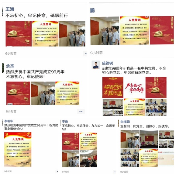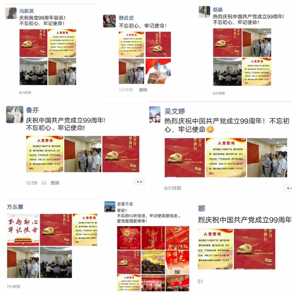 为了丰富活动形式,强化教育效果,直属单位党总支还组织开展党员在党的生日这一天,现场统一交纳党费活动;开展党员亮身份、明誓言活动。党总支统一为党员们制作了带有个人姓名及入党时间的入党誓词图片,让大家永远铭记入党宣誓瞬间,牢记入党初心与神圣使命。每位党员怀着无比激动的心情在微信朋友圈分享了7月党费缴纳凭证、入党誓词图片和主题党日活动照片,为庆祝我们党99岁生日献上美好的祝福与庄严的承诺!