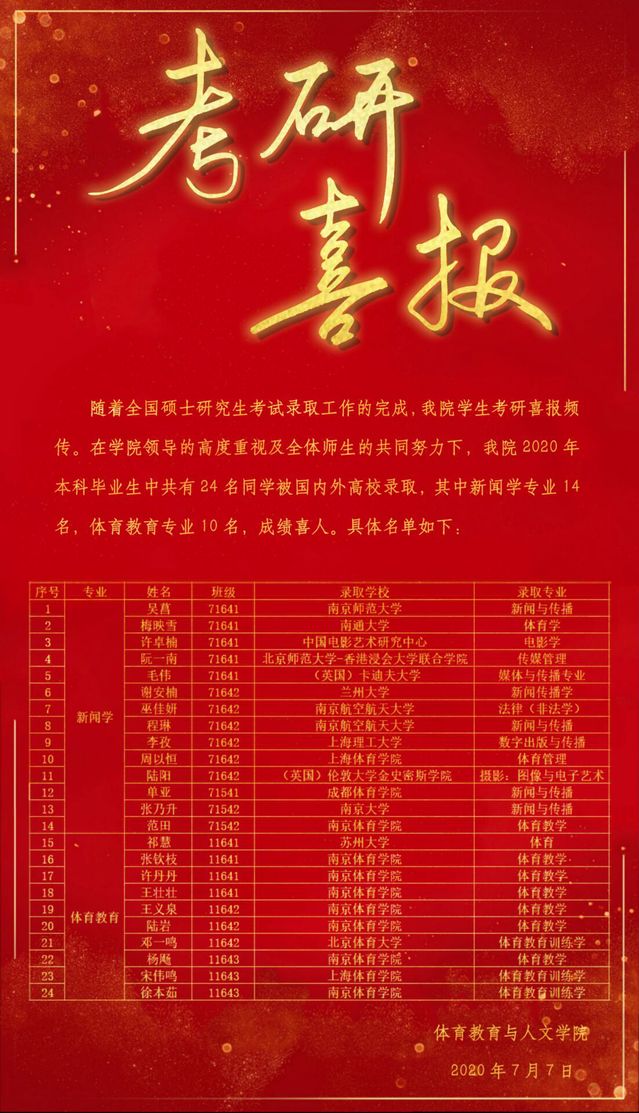 随着全国硕士研究生考试录取工作的完成,我院学生考研喜报频传。在学院领导的高度重视及全体师生的共同努力下,我院2020年本科毕业生中共有24名同学被国内外高校录取,其中新闻学专业14名,体育教育专业10名,成绩喜人。具体名单如下: