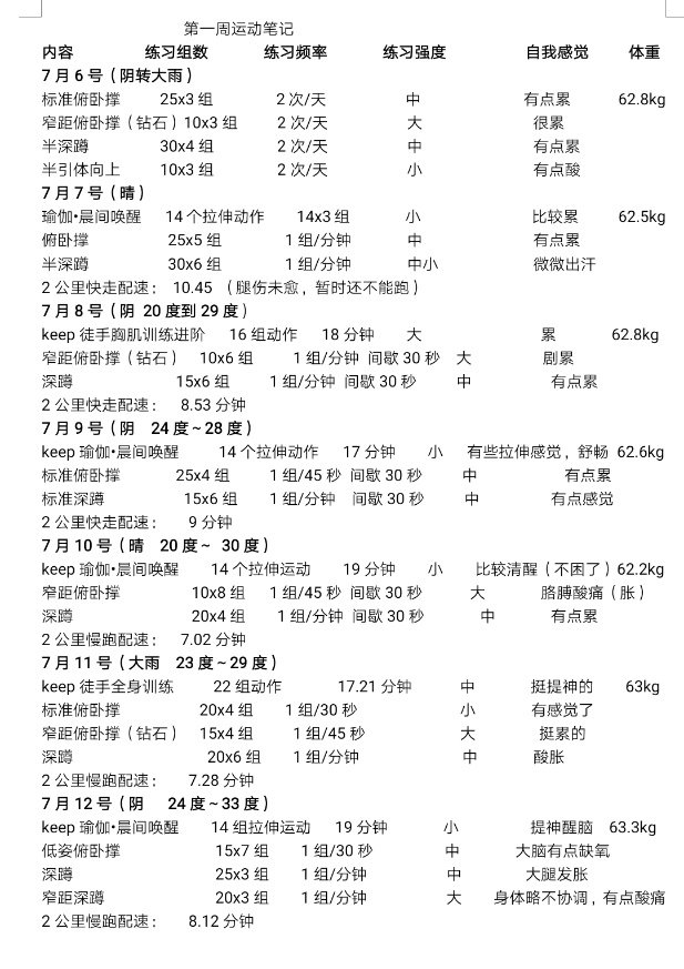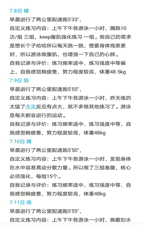 本周则是整个备赛计划的第一周。体育教育专业18级学生已经按照计划开展了第一周的暑期训练。学校根据比赛内容以及学生们的弱项制定了三部分内容,分别是身体素质练习、英语和操化。身体素质练习包括2公里长跑和自主练习,学生可以根据自身的情况进行针对性训练,以便于更好地提高自身身体素质和运动技能;英语分为单词、阅读、口语,同学们通过扇贝学习软件进行每天的打卡学习;操化分为舞动青春、放飞理想和英雄少年,同学们在第一周进行自学,并在之后的每一周进行视频录制。整个学习过程采取小组制,便于同学们互相帮助,互相交流,互相监督,并坚持每天进行打卡汇总,记录同学们的学习状况。