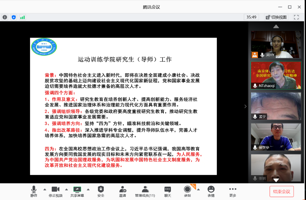 8月11日,运动训练学院通过线上腾讯会议方式,由赵琦院长主持并传达学习习近平总书记对研究生教育的重要指示精神,全面贯彻党的教育方针,落实立德树人的根本任务。运动训练学院副院长、研究生导师张明,研究生导师王志军、朱建国、周晓军、孟宁等12人参加会议。