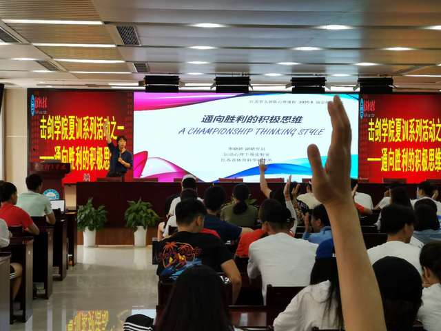 8月22日上午,击剑学院邀请江苏省体科所副研究员毕晓婷为全体管理干部、教练员、运动员上了一堂题为《通往胜利的积极思维》的心理讲座。