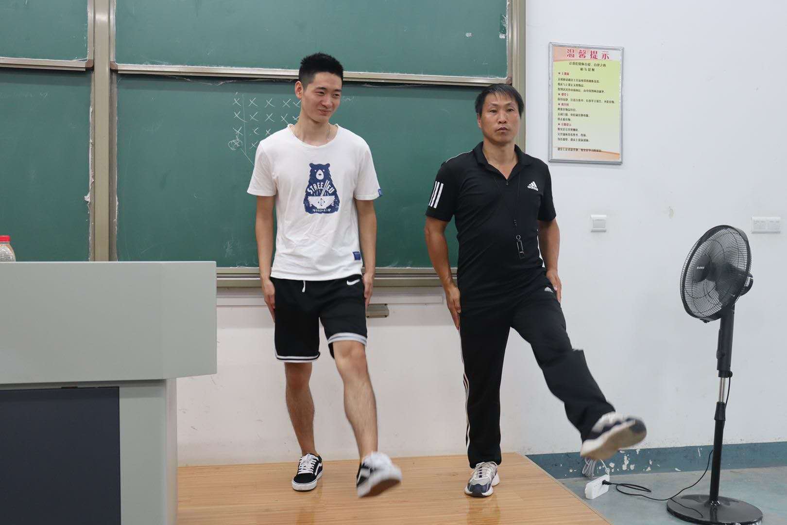 在实践交流中,张红军对体育教师上课时的仪容仪表以及教姿教态进行讲解和演示,并在现场邀请一名同学上台做示范并指出易犯错误。
