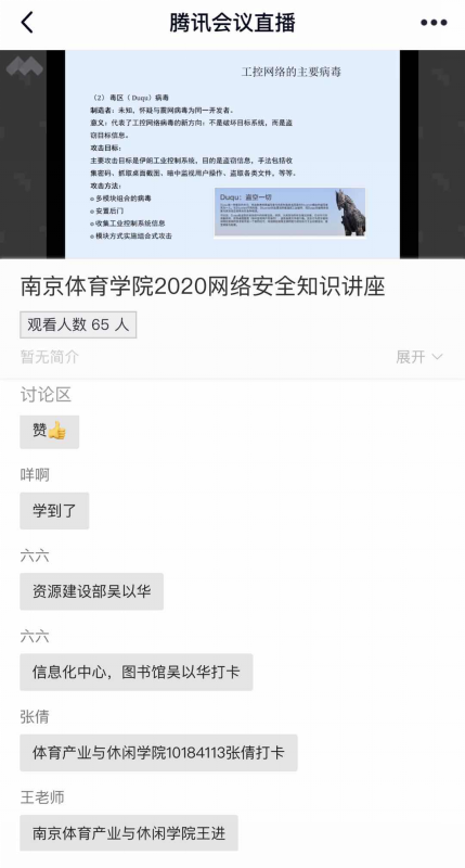 为进一步加强36365创文工作,培育36365师生的网络安全意识、文明的网络素质、良好的上网习惯、网络防护技能,36365特邀南京理工大学计算机学院教授、博士生导师博士生导师、信息化建设与管理处处长、江苏省计算机学会信息安全专委会副主任、网络空间安全专家李千目于9月14日晚7点,在在腾讯会议直播间进行了网络安全知识讲座。体育产业与休闲学院组织师生在线聆听并参与提问。