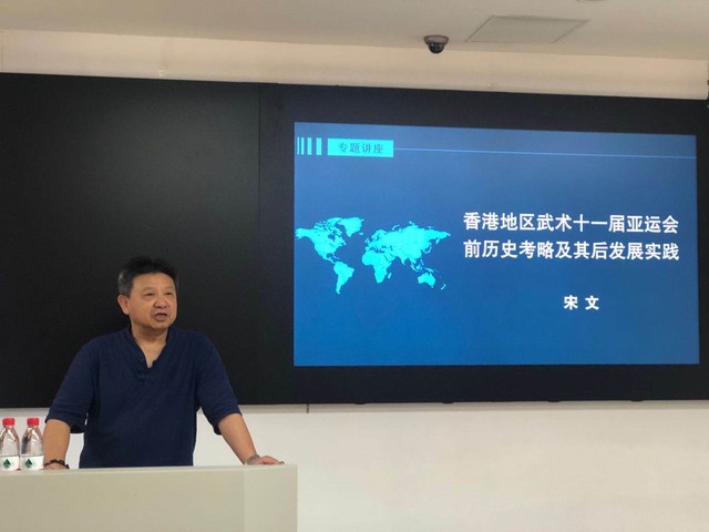 9月23日上午,中国体育工作者联会副主席,香港健身气功总会副主席,香港健身气功太极联合会会长宋文应邀莅临武术与艺术学院、中国近代武术研究中心进行了一场题为“香港地区武术十一届亚运会前历史考略及其后发展实践”的讲座。武术与艺术学院院长支川、副院长杜家俊、武术系全体老师及部分专业相关学生聆听了讲座。