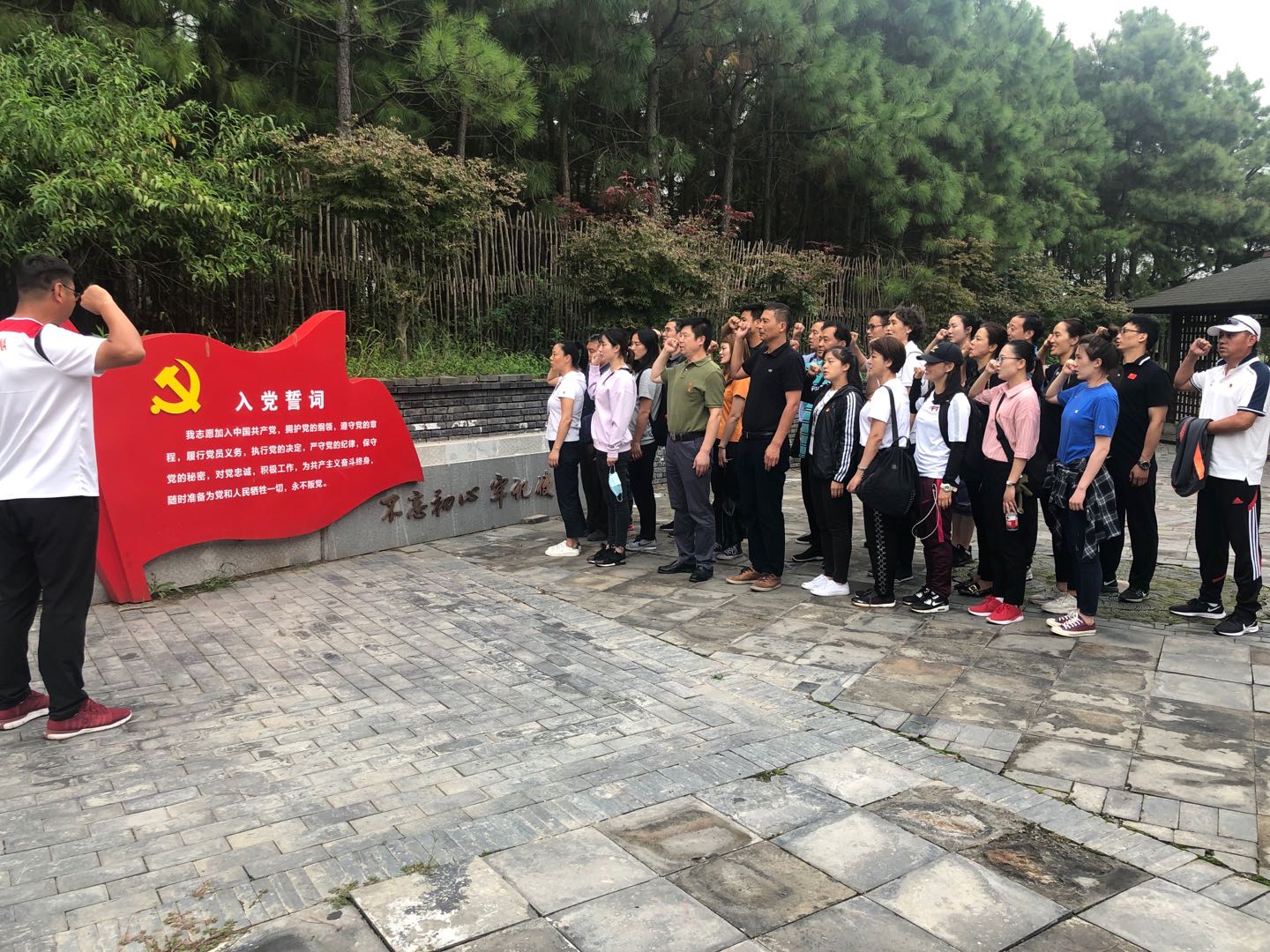 在宣誓广场,全体党员教师面对鲜红党旗,以饱满的精神状态、洪亮的声音重温入党誓词,表明为党的教育事业奋斗终身的坚强决心。