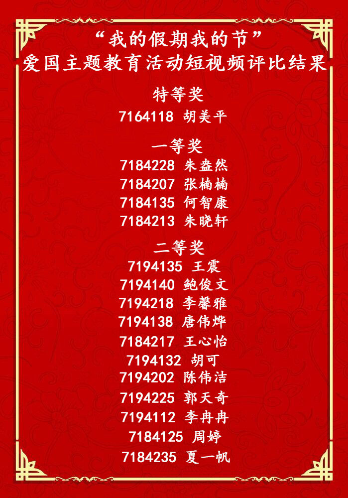 体育传媒系在校的二、三年级的同学们全部参加本次“我的假期我的节”短视频制作大赛。经过初审,40部作品入围了最终的评审。10月6日下午,体育传媒系邀请校内专家对入围的40部作品进行了最终评审,最终来自71842班胡美平同学关于回家路途中歌颂我国美丽的风景的作品获得了特等奖;朱盎然等四名同学关于电子竞技拍摄实习工作、在校园歌颂祖国、充实自我以及想念家人等的作品获得了一等奖;十一名二等奖、十四名三等奖以及十名优秀奖。