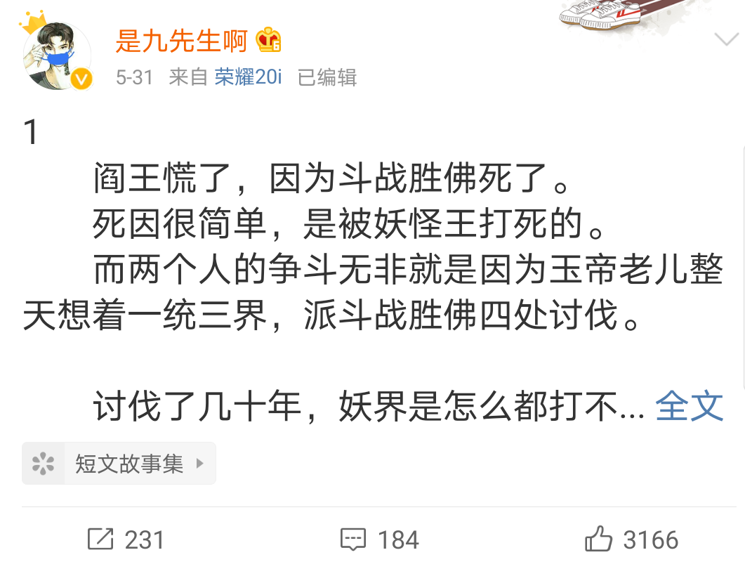 目前孙裕捷的微博(id:是九先生啊)粉丝数已经突破50万大关,日常互动数据也十分可观,微博也成为孙裕捷现在的主要更新平台。从小说网站转战微博,孙裕捷的初衷是能够积累人气,培养一批固定的读者,谁也想不到,现在的微博人气博主在开微博之初经历过一段怎样心酸的时期:“还记得刚开始的时候发微博更文,一共就三个赞,一个是我自己,另外两个是我自己的小号,哈哈哈。”