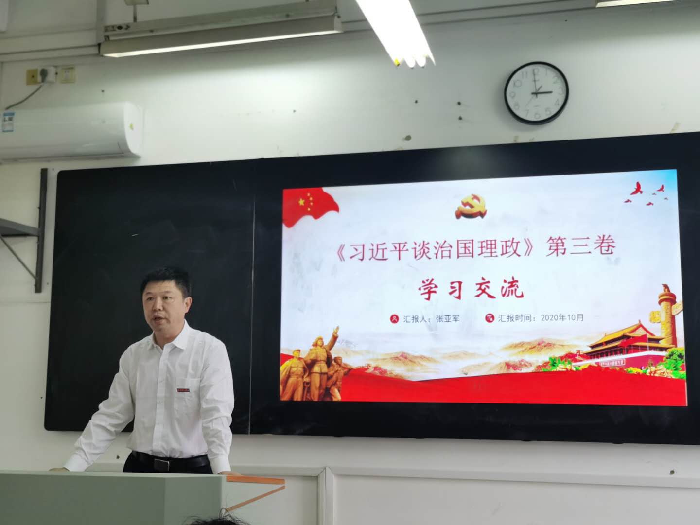 为进一步贯彻落实校党委宣传部、党委组织部关于认真组织学习《习近平谈治国理政》第三卷的通知精神,引导学院党员、教师学懂弄通做实习近平新时代中国特色社会主义思想,系统掌握习近平总书记提出的许多具有原创性、时代性、指导性理论成果,推进学院“十三五”圆满收官,10月13日下午,学院党总支书记张亚军为全院教师上了一堂“学习《习近平谈治国理政》第三卷学什么、怎么学”的主题党课。