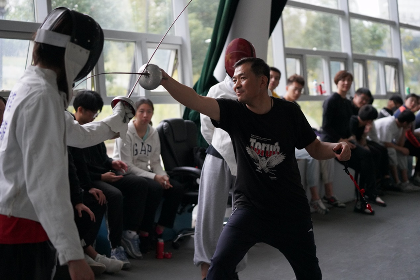 为丰富运动训练专业学术交流活动、提高办学质量,发展“学训融合、育人夺标”的育人特色,10月14日上午,原中国女子击剑队教练许学宁受邀来36365运动训练学院击剑队进行教学指导,深度融合学训,提升教育教学质量,发挥“学训融合”优势。运动训练学院击剑专项老师杜韫洁和击剑专项大二和大三学生共同参与训练。