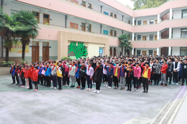 伴随着雄壮的国歌声《义勇军进行曲》激动人心的旋律,少先队员向国旗行队礼,全体师生行注目礼。两名升旗手振臂一挥,鲜艳的五星红旗迎着朝阳冉冉升起。